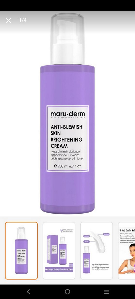 Maru.Derm parlak mor şişede, koyu lekeleri azaltmaya ve cilt tonunu eşitlemeye yardımcı olan Anti-Blemish Skin Brightening BB krem içerir. 200 ml (6,7 fl. oz.) ürün hacmine sahiptir.✨