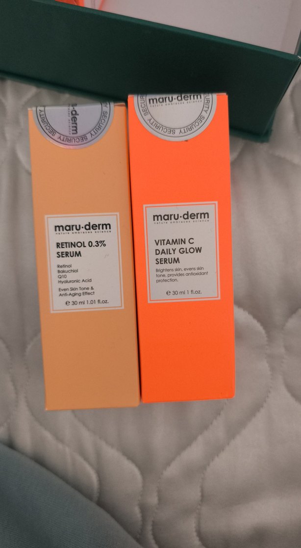 Maru-Derm Retinol 0.3% serumu cilt tonunu eşitler ve yaşlanma karşıtı etki sağlar. Vitamin C Daily Glow serumu cildi aydınlatır ve antioksidan koruma sunar. Her biri 30 ml şişede. ✨