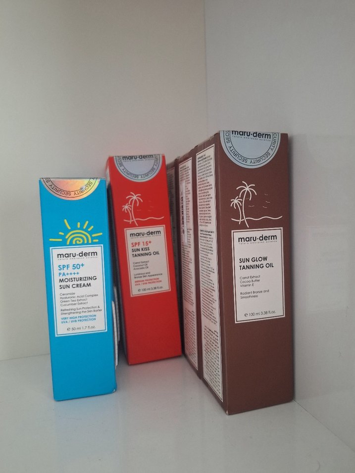 Maru-Derm SPF 50+ nemlendirici güneş kremi ve SPF 15 bronzlaştırıcı yağ içerir. Cildinizi koruyup bronzlaştırmak için ideal. ☀️