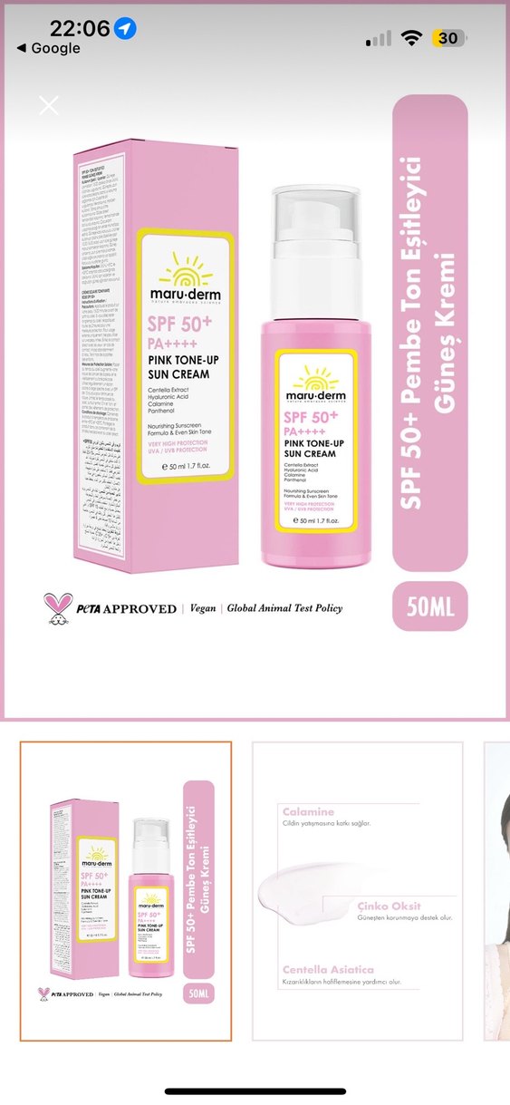 Maru-Derm SPF 50+ Pembe Ton Güneş Kremi, PA++++ koruma sağlar. Pembe tonlandırıcı etkili, vegan ve PETA onaylıdır. 50ML sıfır etiketli bende aynısından oldugu ıcın satıyorym hiç açılmadı jelatinli