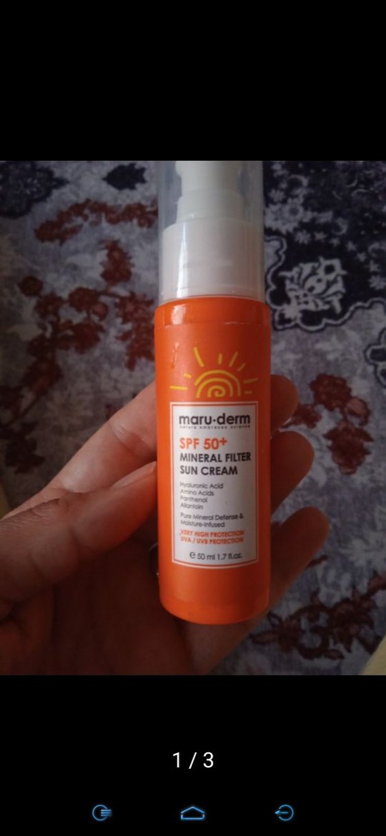 Maru-Derm SPF50+ mineral filtreli güneş kremi, hyaluronik asit ve amino asitlerle yüksek UVA/UVB koruması ve nem sağlar. ☀️