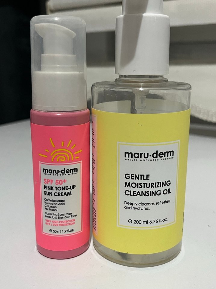 Maru Derm'in temizleyici yağı ve SPF 50+ korumalı pembe tonlu güneş kremi ile birlikte ikili olarak satıyorum temizleme yağını ne kadar kullandığım görselde belli güneş kremininde yarısından fazlası duruyor