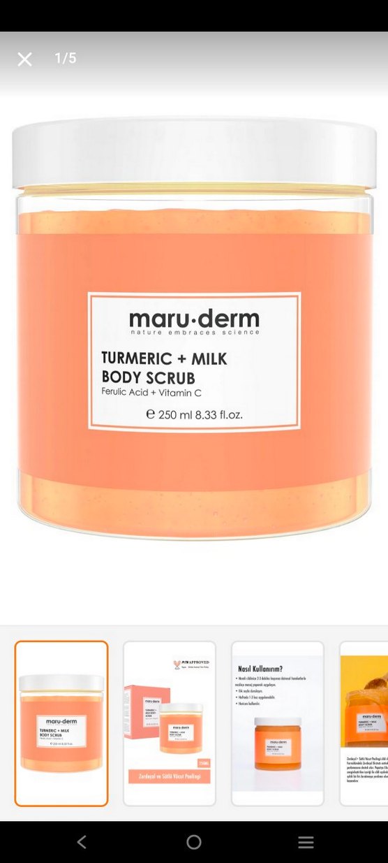 Maru.derm Zerdeçal ve Süt Vücut Peelingi, Ferulik Asit ve C vitamini içerir. Cildi nazikçe arındırarak daha pürüzsüz bir görünüm sağlar. 250 ml kutuda.