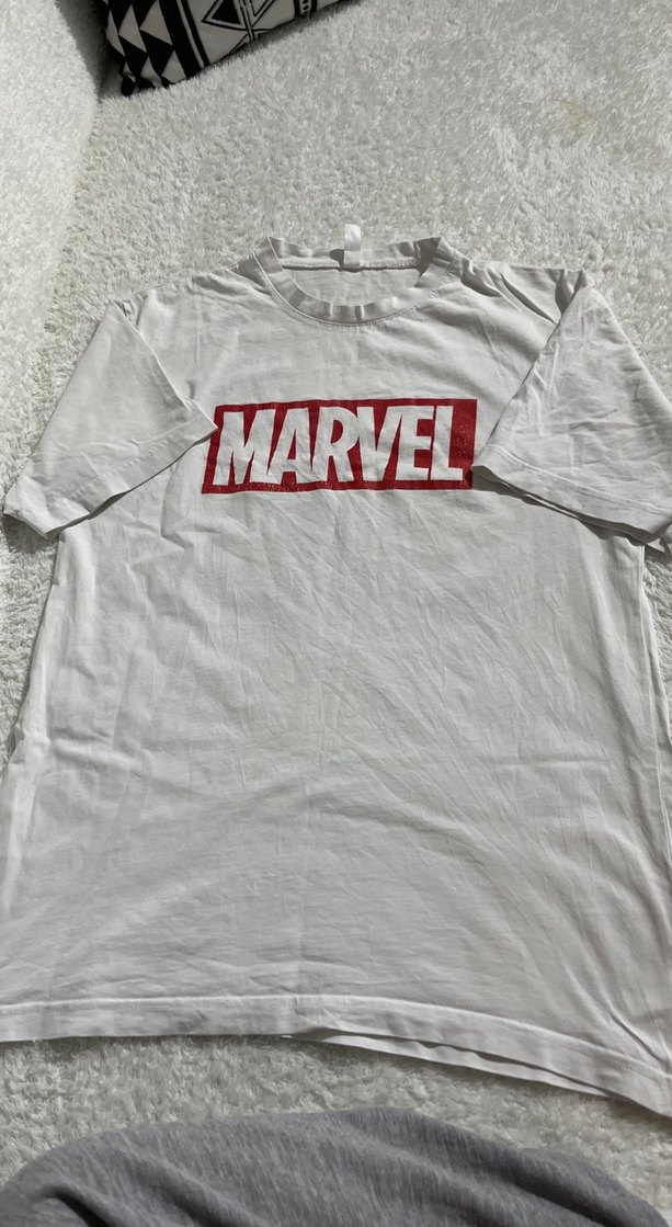 Beyaz pamuk kumaştan, Marvel baskılı, kısa kollu ve yuvarlak yaka erkek tişört. Rahat ve bol kesim, günlük kullanıma uygun. Marvel baskısında deformlar mevcuttur