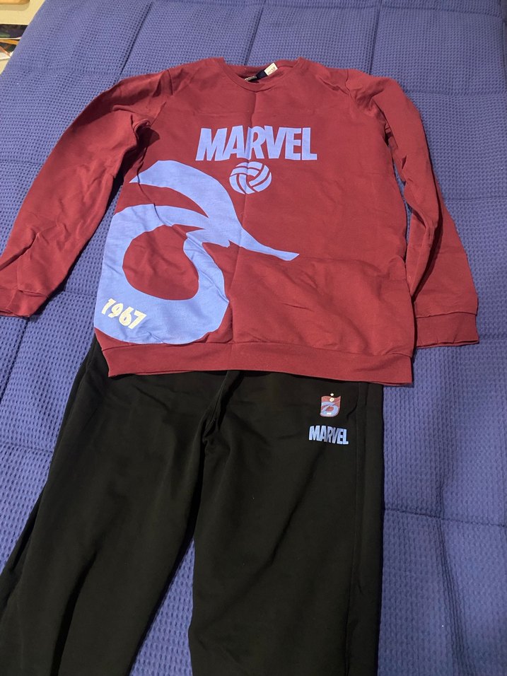 Marvel baskılı, kırmızı sweatshirt ve siyah eşofman altından oluşan erkek çocuk takımı. Bol kesim, bisiklet yaka ve velcro detaylıdır. Rahat ve şık bir sokak stili sunar.