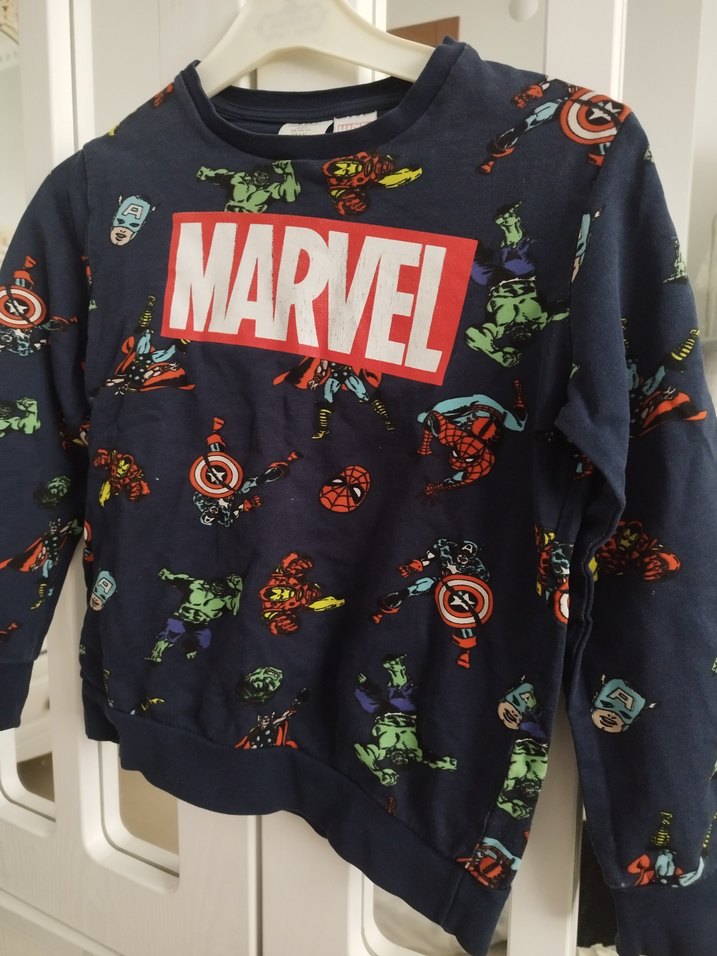 Dar kesim, uzun kollu erkek çocuk sweatshirtü, crew yaka ve tüm vücutta Marvel baskı desenlerine sahip. Düğme detayları bulunur. ♂️