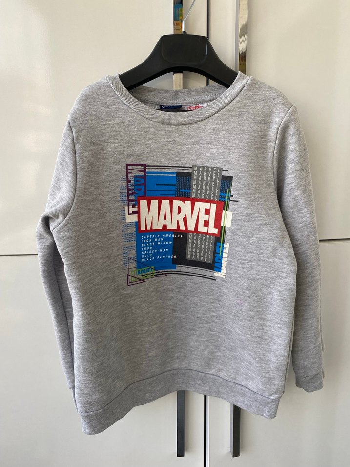 Gri renkli, uzun kollu ve bisiklet yaka erkek çocuk sweatshirtü. Marvel baskılı, yumuşak örme kumaştan ve bol kesimdir. 6-7 yaş bedendir, içi yumuşak tüylü ve kalındır.