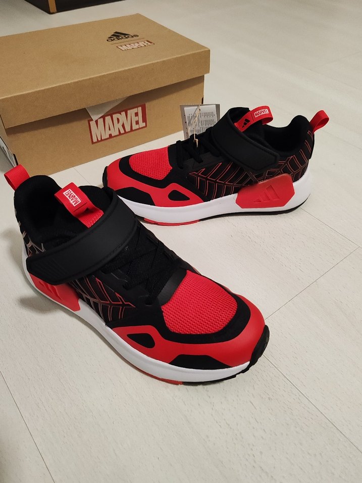 Renkli Marvel baskılı kırmızı ve siyah erkek çocuk spor ayakkabısı, kauçuk taban ve kolay kullanım için cırt cırtlı bant içerir.