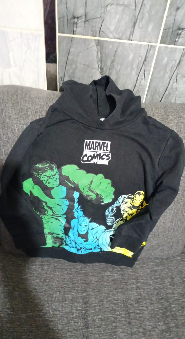 Siyah kapüşonlu, uzun kollu ve düğmeli erkek sweatshirtü, Marvel Comics baskılı canlı süper kahraman figürleri içerir. ♂️