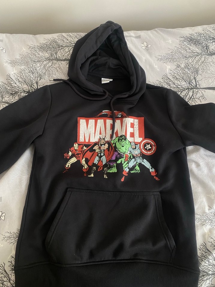 Siyah kapüşonlu sweatshirt, Marvel baskılı, uzun kollu, dar kesim ve sıcak tutan yumuşak kumaştan, cırtcırt detaylıdır. Trendy günlük stil için uygundur. ♂️