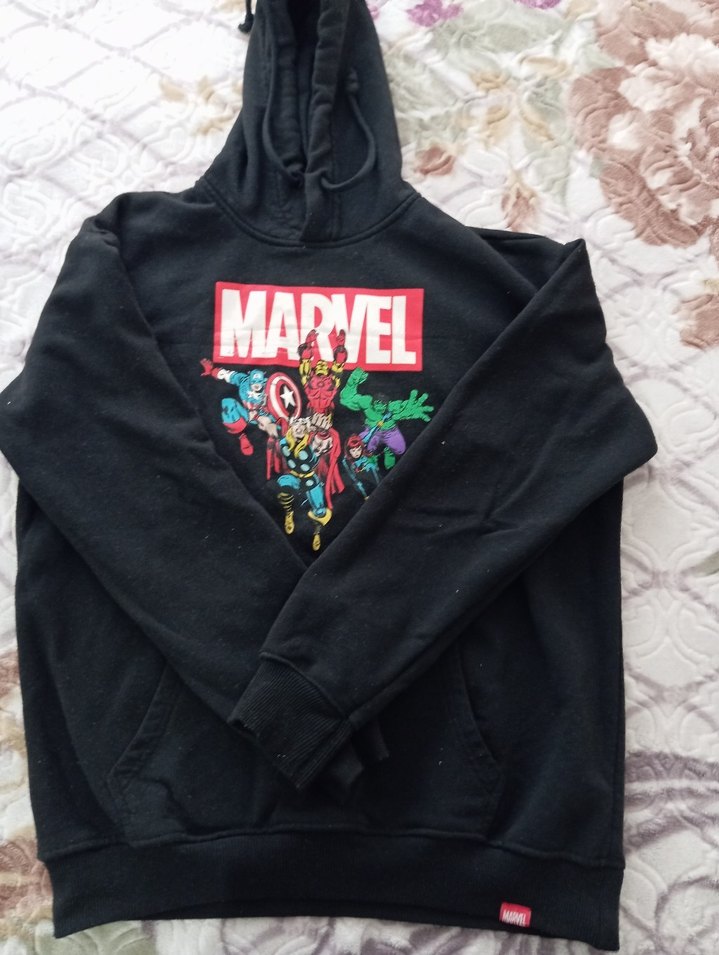 Siyah, Marvel baskılı, kapüşonlu ve fermuarlı cepli, uzun kollu, rahat ve yumuşak dokulu, fitted kesim sweatshirt.