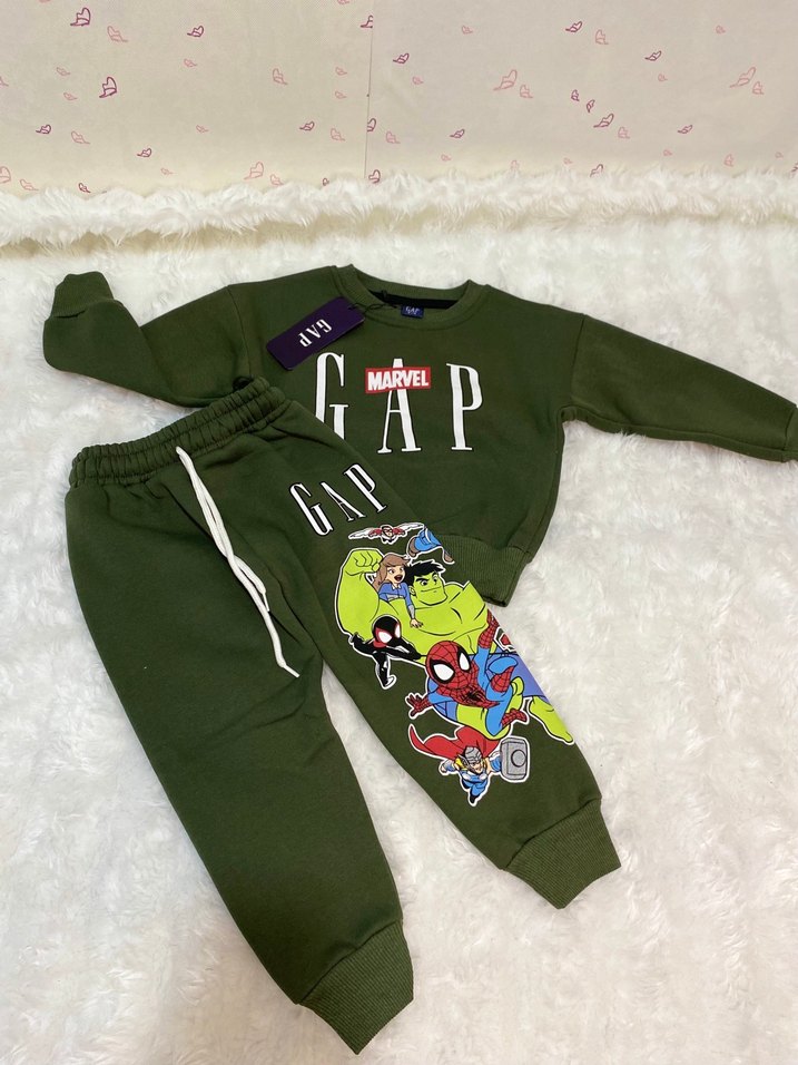 Marvel ve GAP baskılı koyu yeşil erkek çocuk eşofman takımı, bol kesim, yumuşak ve sıcak kumaş. Bisiklet yaka sweatshirt, cırt cırt detaylı, rahat sokak stili için uygundur. ♂️