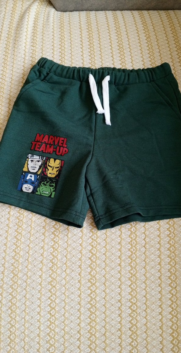 Renkli Marvel baskılı, beyaz bağcıklı yeşil şort. Yumuşak tekstil kumaştan, ayarlanabilir Velcro detayıyla trendy casual tarz için uygun. ♂️