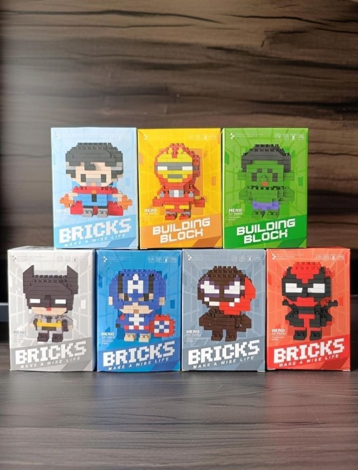 Çeşitli süper kahraman figürlerinden oluşan renkli yapı blokları. Birden fazla canlı tasarım içerir, yaratıcı oyun için uygundur.