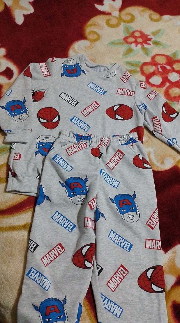 Marvel karakterleri ve logolarıyla desenlenmiş gri çocuk pijama takımı. Yumuşak ve sıcak kumaştan üretilmiştir, rahat uyku için uygundur.