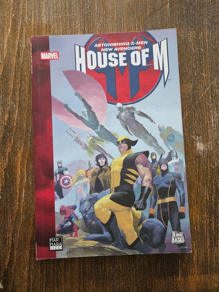 Marvel'in House of M çizgi romanı, kapakta X-Men ve Avengers karakterlerini gösteriyor. Dinamik bir sahne içeriyor.