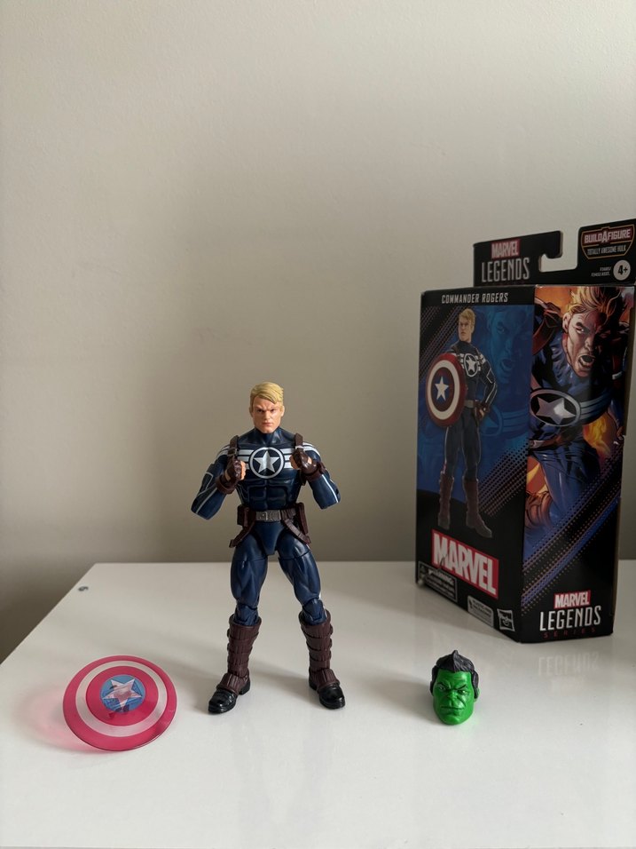 Marvel Legends Kaptan Amerika aksiyon figürü koyu mavi kostümü, kalkanı ve Hulk görünümlü ek başlığı mevcuttur. Orijinal ve kutuludur. Defosu yoktur yalnızca vitrinde kullanıldı.