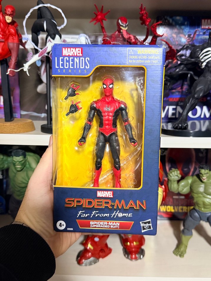 Marvel Legends Spider-Man aksiyon figürü, "Far From Home" filmindeki geliştirilmiş kostümüyle. Değiştirilebilir eller ve canlı kırmızı ile koyu renk detayları içerir. ️