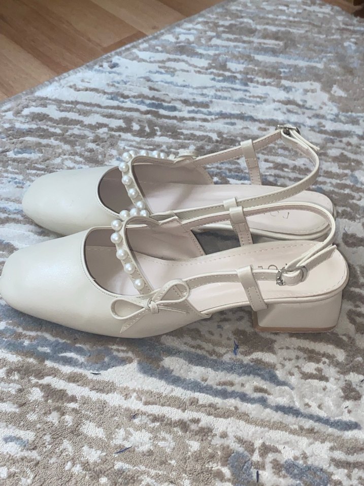 Bej renkli, toka detaylı ve inci süslemeli blok topuklu kadın ayakkabısı. Düz ve desensiz, kauçuk malzemeden yapılmıştır. Düğünler için uygun.