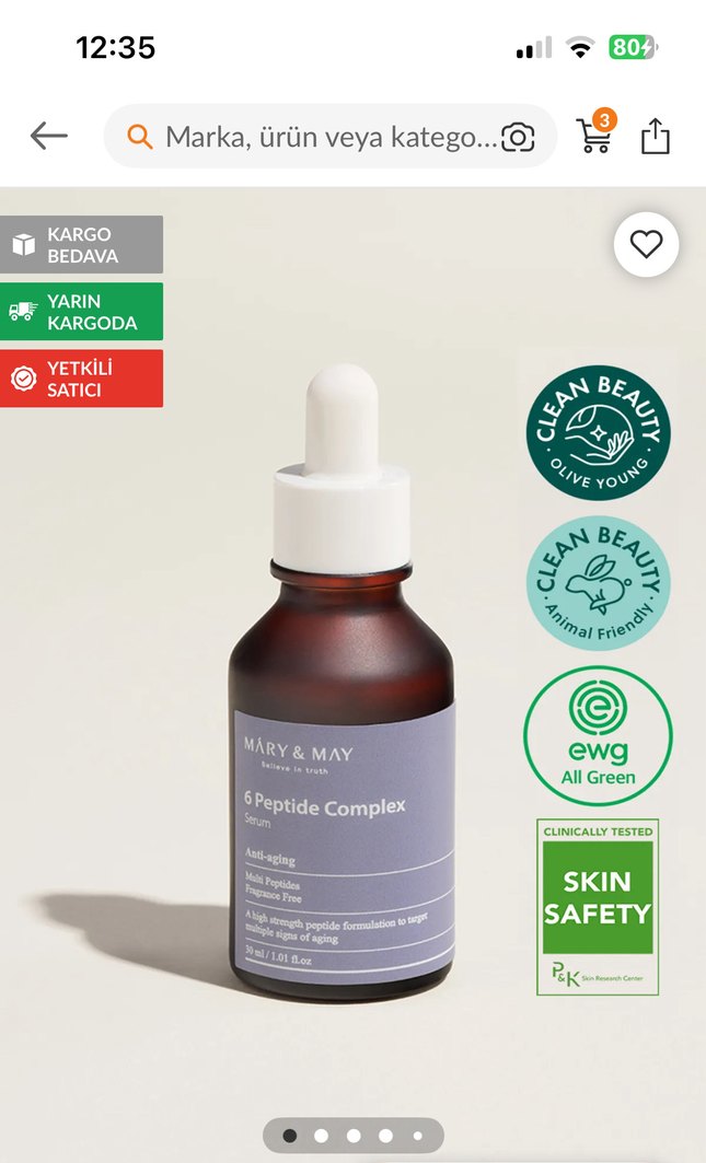 Mary & May 6 Peptide Complex serumu, cilt yenilenmesini destekleyen ve yaşlanma belirtilerini azaltmaya yardımcı peptitler içerir. Klinik olarak test edilmiştir.