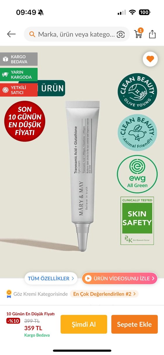 Mary & May Tridecane Asit ve Glutatyon içeren göz kremi, cilt güvenliği sağlar ve klinik olarak test edilmiştir. Temiz güzellik, hayvan dostu ve EWG All Green sertifikalı.