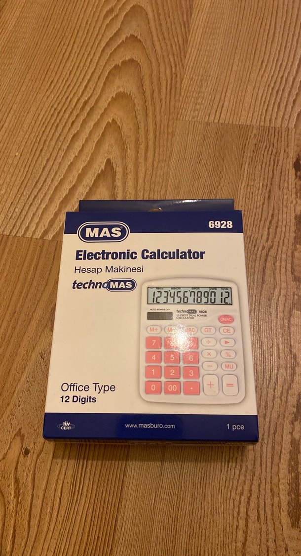 MAS marka, 12 haneli ekranlı, beyaz ve gri tuşlu ofis tipi elektronik hesap makinesi. Temel hesaplamalar için uygundur.
