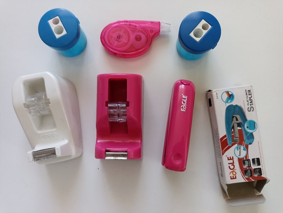 Bant kesicinin biri Mas marka. Diğeri isim yazmıyor Temizler. Pembe ve mavi renklerde, kalem açacağı, düzeltme bandı ve diğer küçük kişisel bakım aletlerini içeren renkli set. ✂️