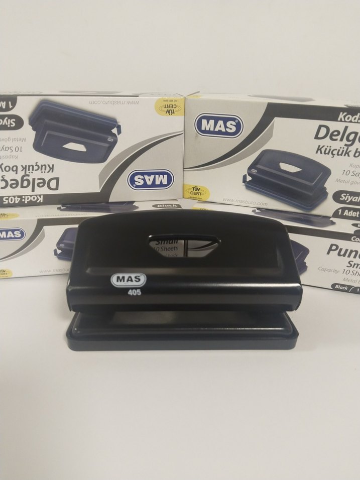 MAS marka küçük boy siyah delgeç, 30 sayfaya kadar delme kapasitesine sahip, kompakt ve kullanışlı masaüstü aksesuarı. ️