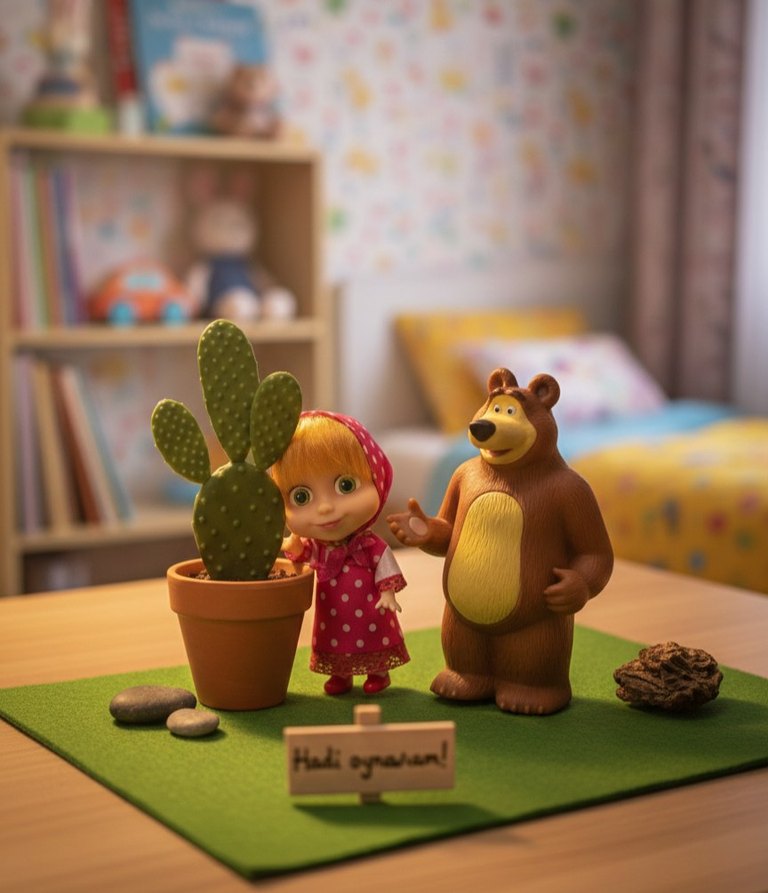 Renkli ayıcık ve kız figürleri, saksıdaki kaktüsle birlikte yeşil taban üzerinde küçük taşlar ve tabela ile sergileniyor.