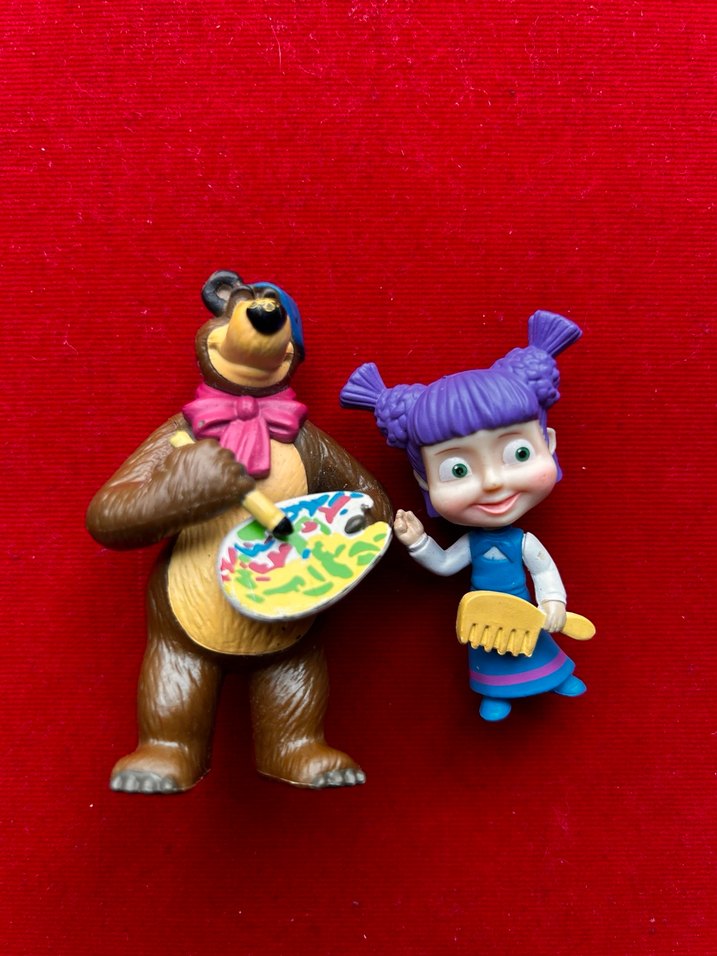 Koyu kahverengi ayı figürü renkli palet tutuyor, mor saçlı kız figürü ise fırça taşıyor. İkisi de neşeli ifadeye sahip. #maşailekocaayı