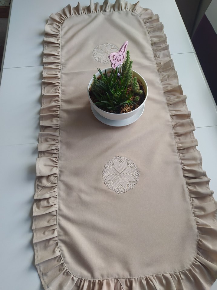 kapicino rengi,bej,yada sutlukahve dantelli kenarı fırfırlı duck keten kumaştan 110 cm *50 cm ebatlarında ranır,runner #ranir #runner #masaortusu #ceyiz