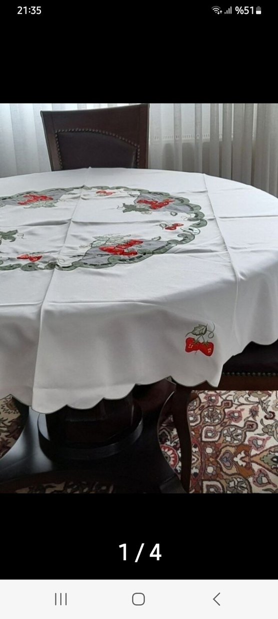 danimarkadan alındı. çap 2 metre. üzerinde çilek aplike edilmiş. çay sofrası içın ideal.güzel sohbetlerle nefi bir görüntü veriyor.