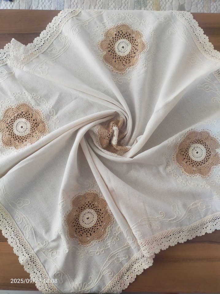 Hafif ve zarif tasarıma sahip, nakışlı bohem desenli beyaz masa örtüsü, ince dantel kenarlarla tamamlanmıştır. Dantelleri el örgüsüdür. Buldan işi. Keten kumaş