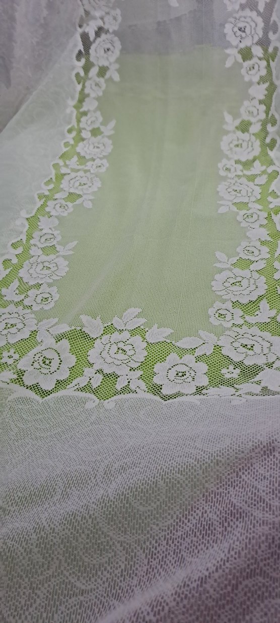 Nakışlı çiçek desenlerine sahip beyaz vintage masa ortusu hafif ve zarif bir tasarımla klasik bir dokunuş katar. diktortgen 240 cm ye 155 defolu
