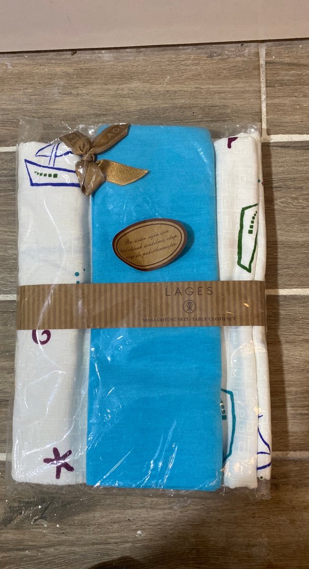 Mavi beyaz masa örtüsü seti. baskılı desen detaylarıyla günlük kullanım sunar.