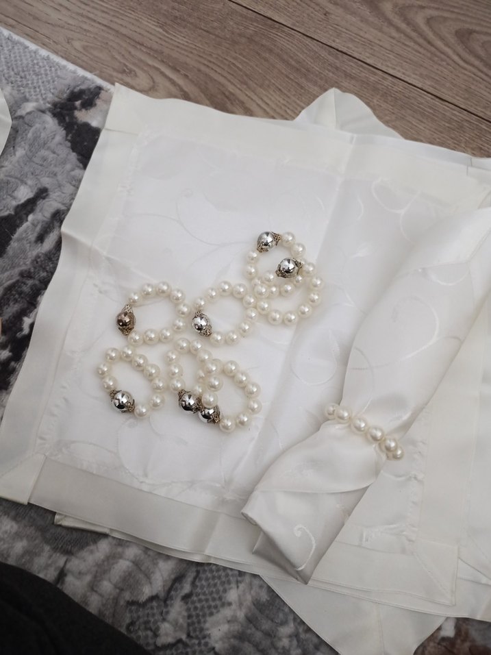 8 kişilik masa örtüsü takımı, 1 adet masa örtüsü, 8 adet peçete, İnci ve gümüş detaylı beyaz boncuklu peçete halkaları, modern klasik şıklık katıyor. masa örtüsünde birkaç tane küçük yanık izi var resimde de görünüyor zaten çok küçük yakından bakınca görülüyor peçeteler ve boncuklar hiç kullanılmadı