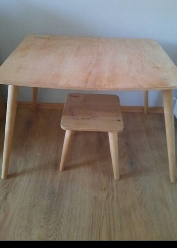 Ahşap calisma masasi bemi markadir.uzerinde ufak lekeler cizikler var resimledim temizlemeyi denemedim.hafif egimi vardir resimlemeye calistim aldigimda da oyleydi.aslinda duz olmasi gerekiyormus biz bu sekilde kullandik sorun olmadi.3-6 yaşa uygun.ayaklari vidalidir kolay kurulur.ayaklarinin altina mobilya keçesi yapıştırıp gondericem.