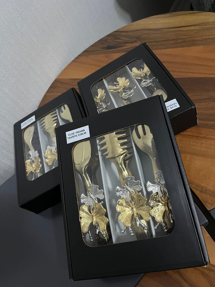Altın renkli, canlı koyu saplara sahip ve çiçek detayları bulunan çatal kaşık seti, sofranıza şıklık katıyor. sıfır kutulu
