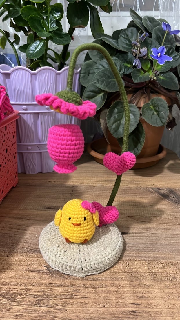 Sarı civciv ve pembe çiçeklerin yer aldığı renkli, örgü Masa süsü