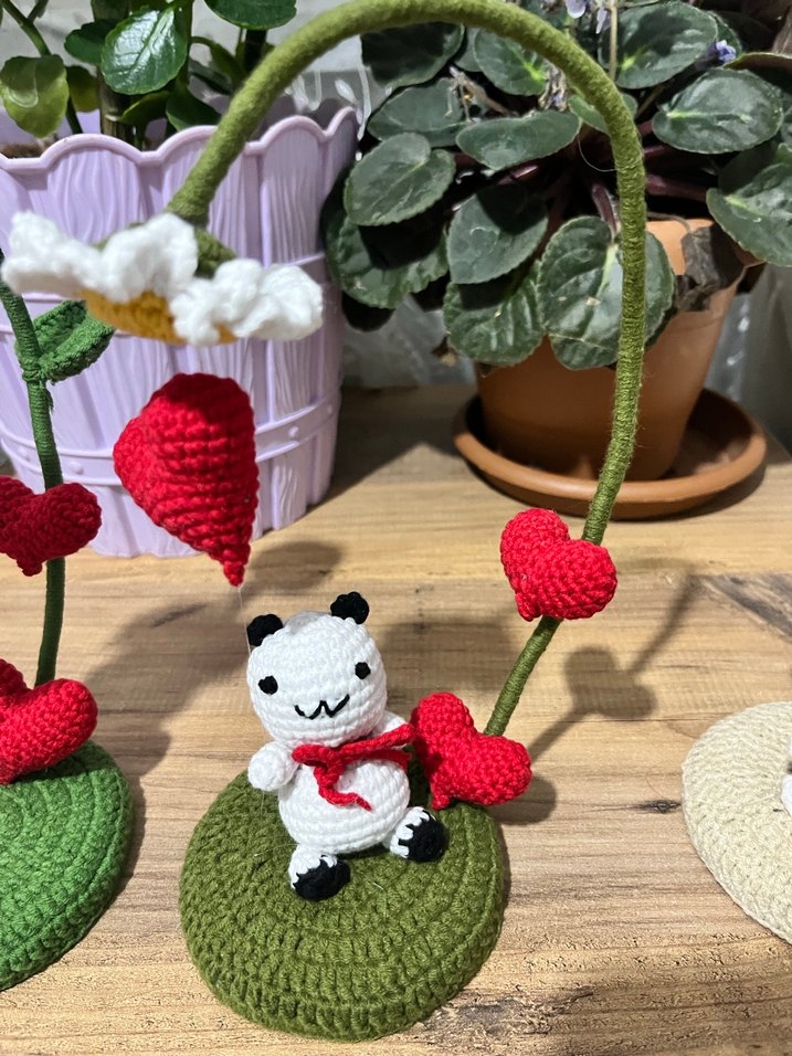 Tığ işi beyaz panda figürü, yeşil taban üzerinde kırmızı kalp süslemeleriyle renkli peluş oyuncak.