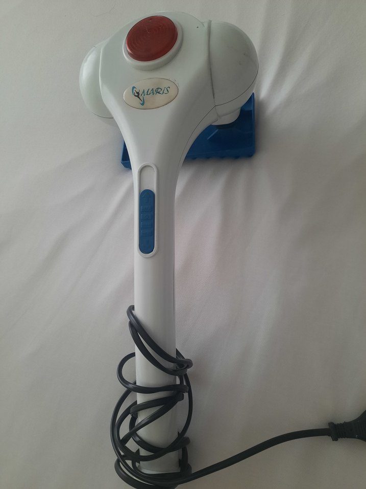 Uzun saplı, mavi tutma alanlı beyaz kişisel bakım cihazı. Güç kablosu mevcuttur. ⚪