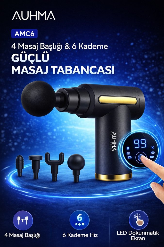 AUHMA masaj tabancası, 4 farklı başlık ve 6 kademeli hız ayarıyla gelir. LED dokunmatik ekranı sayesinde kolayca kontrol edilir. Siyah renktedir. sıfır ürün