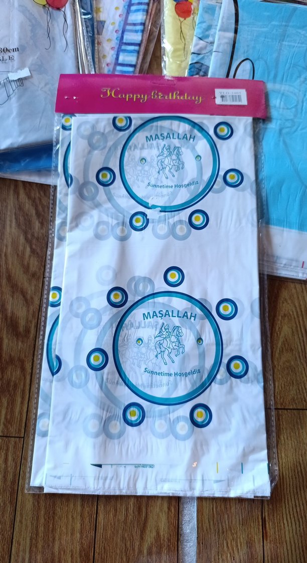 Açık mavi renginde, "MASALLAH" yazıli masa örtüsü Nazar boncuğu ve dairesel desenler içerir. ☀️