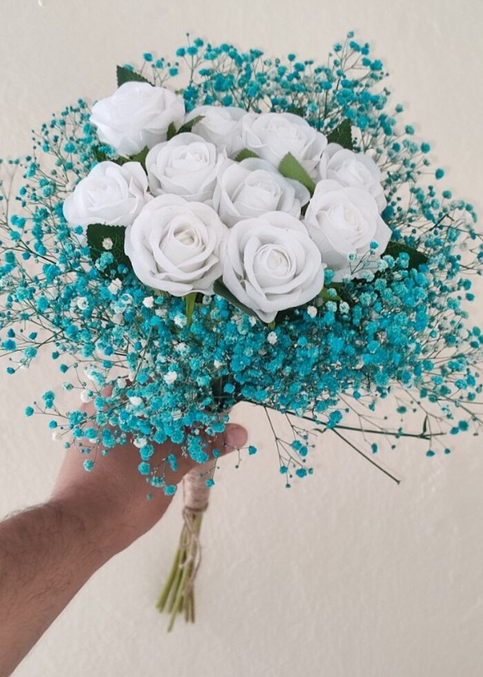 Mavi renk şoklanmış cipsolu lüx gelin buketi. Trend gelin çiçeği gelin buketi. 1 Adet gelin buketi Dammat yaka çiçeği hediyeli