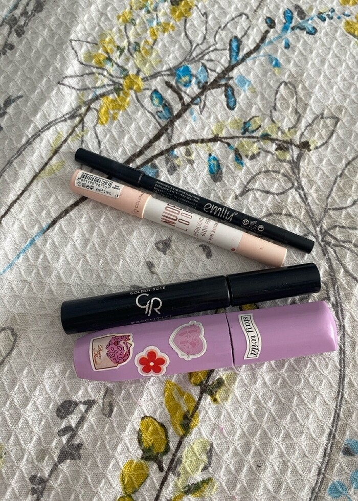 İki tane maskara bir tane highlighter göz kalemi bir tane de siyah göz kalemi hepsinin kalitesi çok iyi çok az kullanıldı pastel ve Golden rose