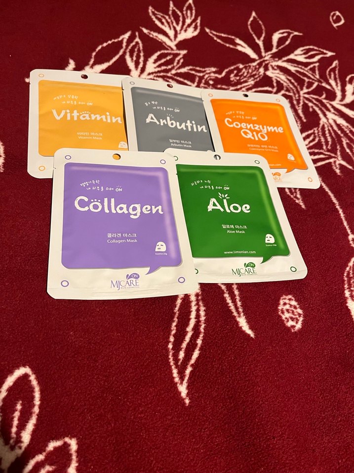 Vitamin, Arbutin, Koenzim Q10, Kolajen ve Aloe içeren beş adet yüz maskesi seti, cildi besleyip canlandırır.