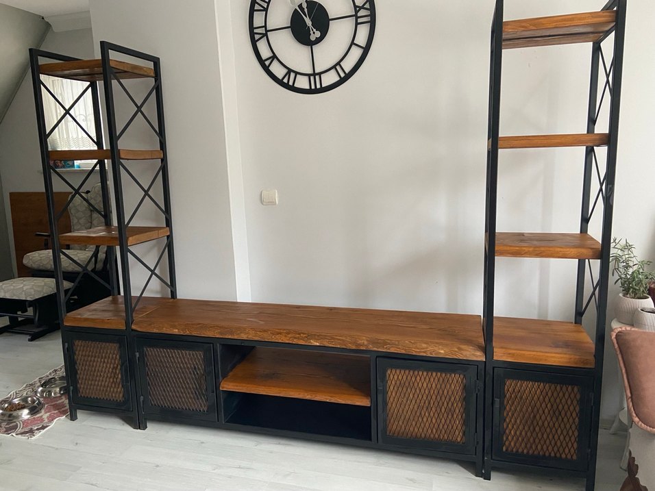 Mobilyalarımı değiştireceğim için Koyu kahverengi masif ahşap ve metal karışımı TV ünitesi, 2 adet yan sehpa ve konsol satılıktır. Tv ünitesi: 15.000 Yan sehpalar (2 adet): 2.000 Konsol: 5.000
