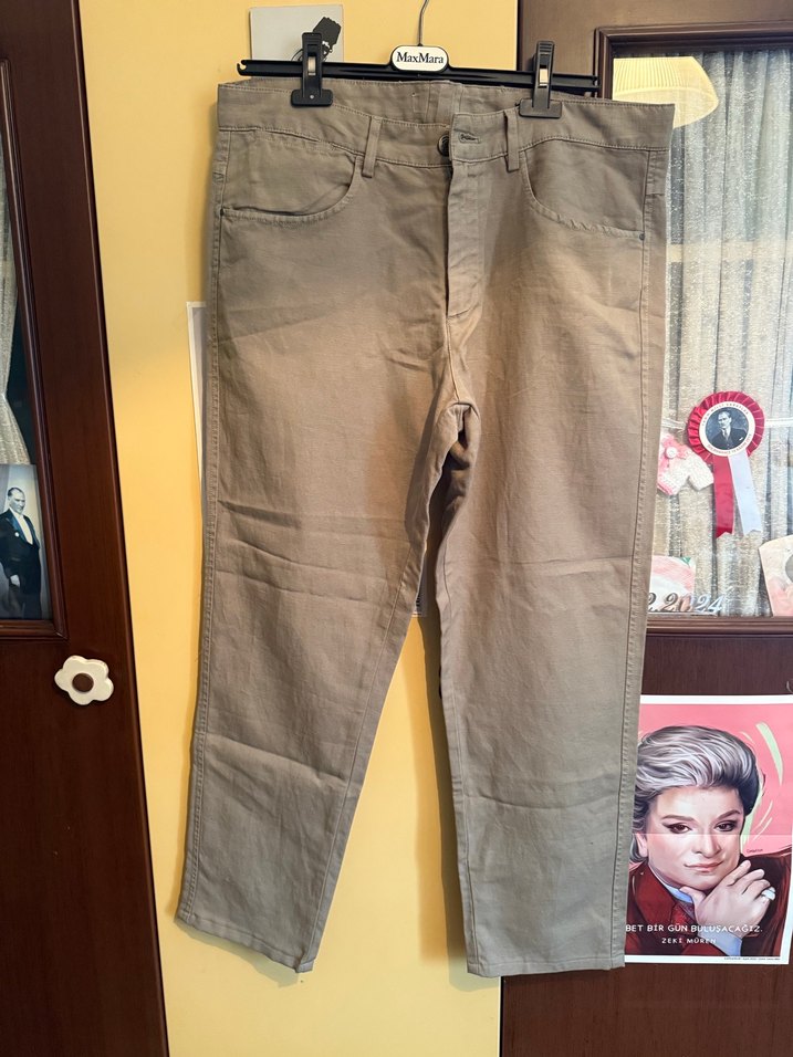 Bej renkli keten kumaştan, rahat kesimli ve düğmeli, günlük kullanıma uygun midi boy erkek pantolon. Normcore tarzda sade tasarım. Massimo dutti erkek pantolon az kullanıldı