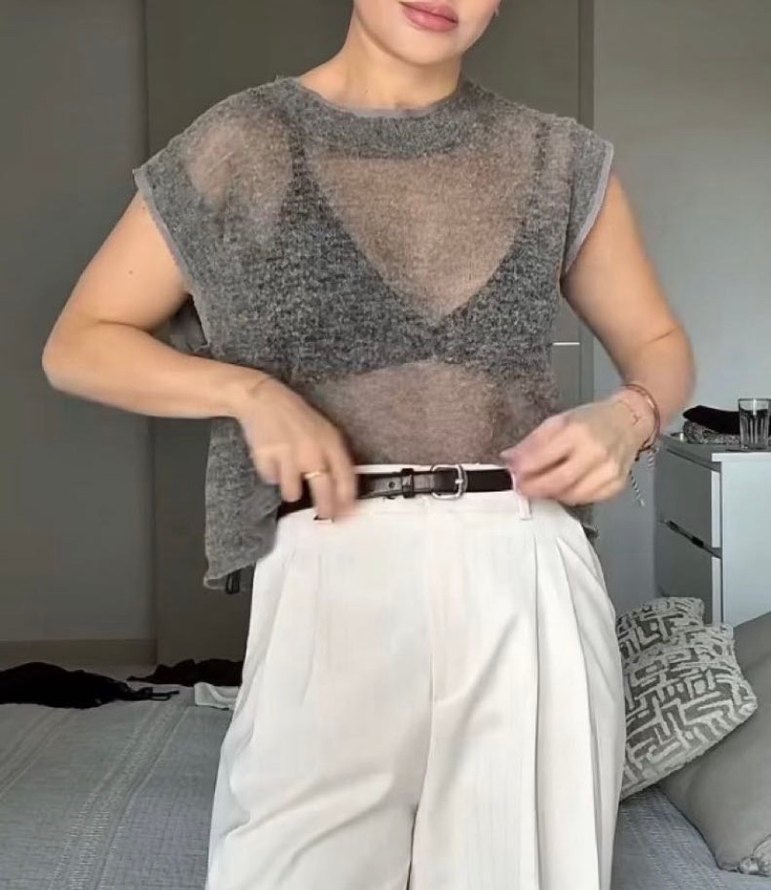 Gri renkte, keten kumaştan örülmüş, kolsuz ve yuvarlak yakalı bol kesim triko. Normal midi boyda, gündelik kullanıma uygun.