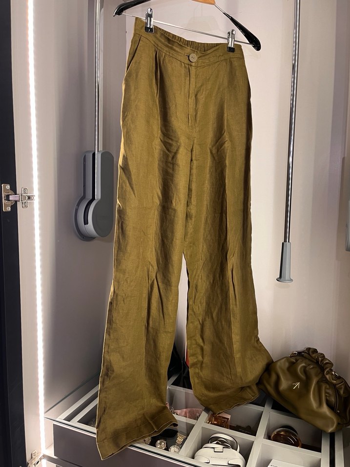 Bol kesim, uzun boy haki keten pantolon, drapeli tasarımıyla rahat ve şık bir görünüm sunar. Ketendir. 4500 TLye yeni sezondan almıştım. Rengi yağ yeşili gibi. Paça boyu vs terzide işlem görmemiştir. Tamamen mağazadan alınmış gibi.